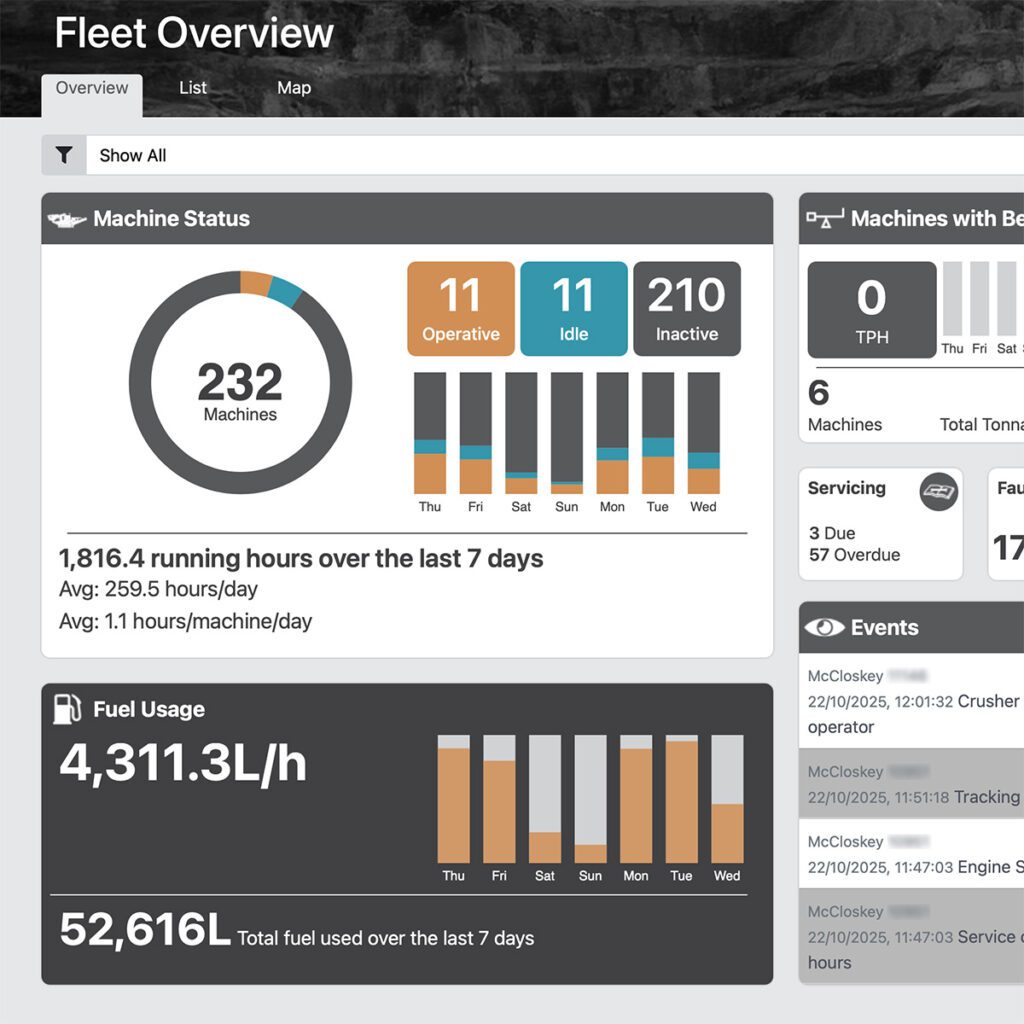 The main Fleet Overview provides you with a comprehensive view of all the machines in your fleet. Quickly apply filter rules to narrow down the information retrieved, whether it be by customer, location or engine hours. You can create many different combinations of filter rules to suit your needs.